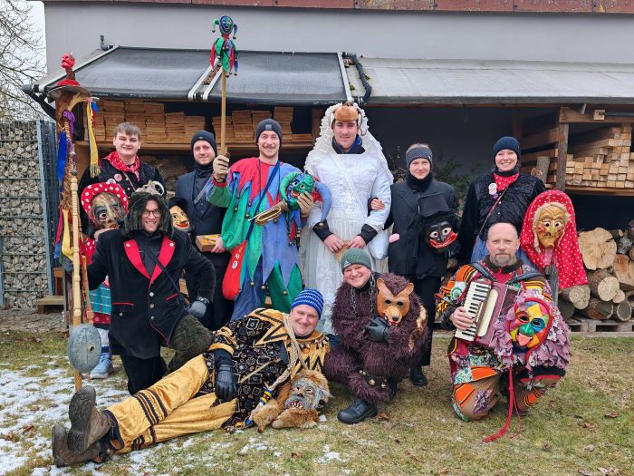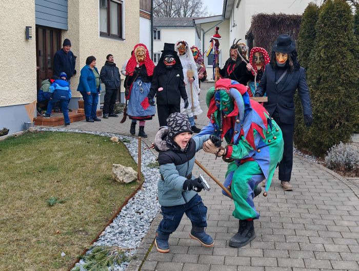 So tobte der zottelige Bär mit seinem bunten Gefolge am Samstag wild und lautstark von Haus zu Haus und wagte hin und wieder mit Bewohnern ein Tänzchen, was ihnen für das ganze Jahr Glück bescheren soll. Sein Treiber hatte alle Mühe, das temperamentvolle „Tier“ zu bändigen, das allerlei Schabernack trieb. Wer sich dem bunten Zug in den Weg stellte und sich nicht rechtzeitig in Sicherheit brachte, hatte schwarzen Ruß im Gesicht. Einige Dekostücke oder Schuhe, die vor den Haustüren standen, sowie Gartenmöbel, Mülltonnen und Roller, fanden sich später auf Bäumen, Wäscheleinen oder anderen Stellen wieder ein. So zog die lustige Truppe am Samstag durchs Dorf und sammelte Spenden. Der Erlös der Sammlung kommt dem Kinderfasching am Faschingsdienstag zu Gute.